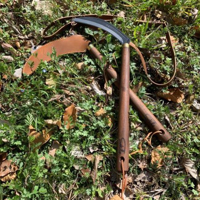 3代続く鎌鍛冶屋がおしゃれに播州鎌を持って頂くために、高級家具などに使用するウォルナット材をハンドルに、真鍮の金具を使用しました。