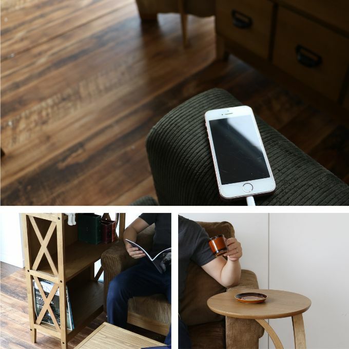 木の素材感を大切にしながら"ノスタルジー"を感じるテイストに仕上げるため、生地にあえてゆとりを持たせ使用感を演出していますています。また、前面のフレーム中央部にはコンセント2口、USBタップが1口ついており、タブレットやスマートフォンの充電に大変便利。