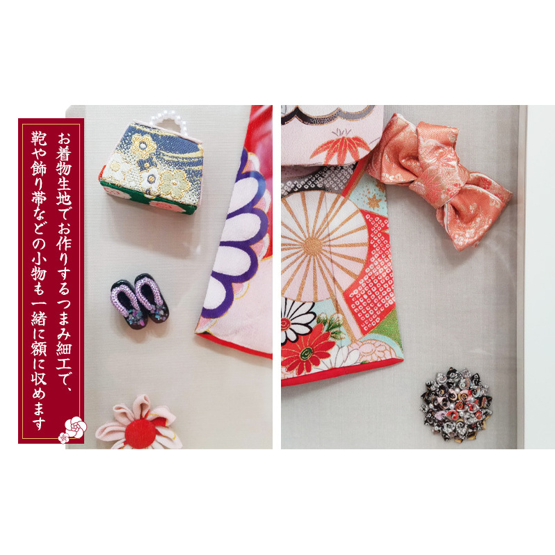 依頼主様よりお預かりする着用することのなくなった形見や思い出の着物を一級和裁技能士が本物の着物をそのままに小さくした本格的なミニチュア着物にお仕立てします。鞄や飾り帯などの小物も小さいサイズで作成し、お着物生地でお作りするつまみ細工を一緒に額(50cm×50cm)に収めたものになります。