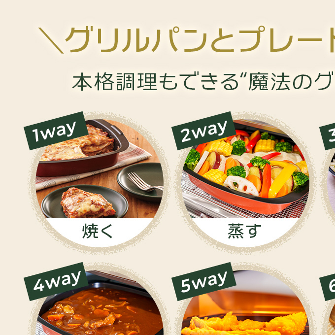 グリル料理、煮込み料理、焼き料理などお料理のバリエーションを広げるグリルパン付。