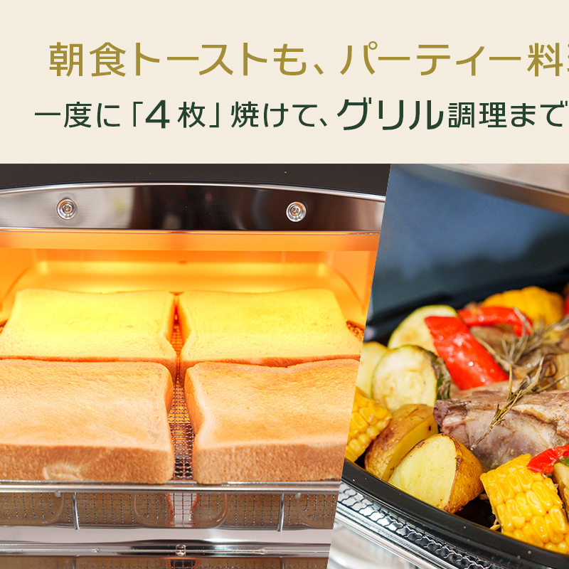 「遠赤グラファイトヒーター」搭載で0.2秒で発熱!食パンを外はカリッと中はふんわりモチモチの焼き上がり。食パンを4枚同時に焼くことができるレトロ調のデザインのトースター。