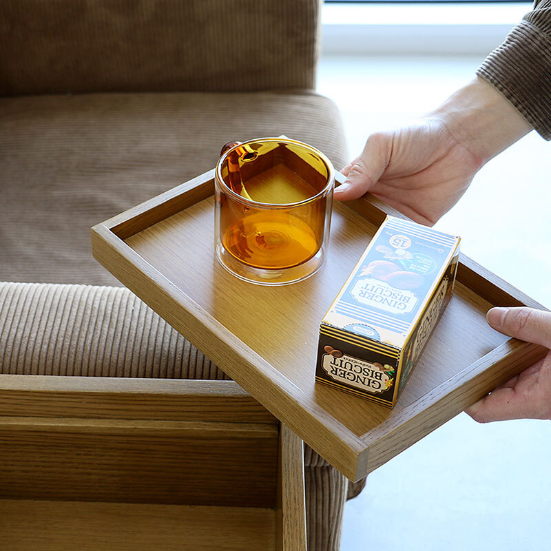 【素材】BOX側板:天然木化粧繊維板(オーク材)、BOX底板・トレー底板:合成樹脂化粧繊維板、トレー側板:天然木(オーク材)、脚・幕板・棚:天然木(ラバーウッド材)