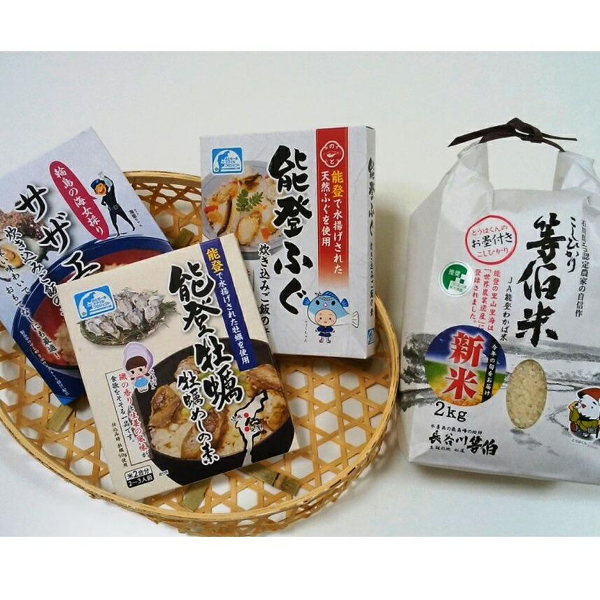 【原材料名】 「サザエ 炊込みご飯の素」剥きボイルサザエ、千切りにんじん、黒こんにゃく、あおさ、しょう油加工品(しょう油、糖類(ぶどう糖果糖液糖、砂糖)、食塩、醸造酢、昆布、昆布エキス、酵母エキス、かつお節エキス、椎茸エキス、調味料(アミノ酸等)酒精、水、(小麦・大豆含む)/「能登ふぐ 炊込みご飯の素」標準和名ゴマフグ、しいたけ、にんじん、たけのこ、フグエキス(標準和名シロサバフグ、クロサバフグ)、鯛だし(鯛エキス、食品、発酵調味料、砂糖、しょう油、昆布エキス、ホタテエキス、たん白酵素分解物、調味料(アミノ酸等)、小麦・大豆・さば含む/能登牡蠣 牡蠣めしの素」牡蠣、ブナシメジ、青さ、しょうが酢漬、カキエキス、しょう油加工品(しょう油、糖類(ぶどう糖果糖液糖、砂糖)、食塩、醸造酢、昆布エキス、酵母エキス、かつお節エキス、椎茸エキス、調味料(アミノ酸等)、酒精、水、(小麦・大豆含む)/精米(七尾市コシヒカリ2kg)