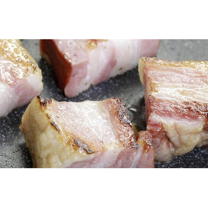 調味液などによる膨張・加重を行っていない為、加熱によって、失われる水分が極めて少なく「焼き縮み」がほとんど起こらない事が「伊吹ハムベーコン」の特徴です。