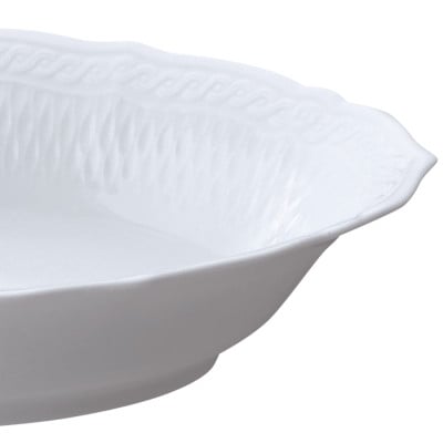 細かい部分まで丁寧にレリーフを施し、日本の洋食器メーカーならではの繊細さを表現しました。古くより日本で親しまれている立涌(たてわく)文様(※1)を現在風にアレンジしたレリーフは、純白で柔らかな表情を引き締めています。縁まわりのレリーフは、連続模様が永遠を表すと言われるギリシャ文様。オールドノリタケ(※2)にも多く用いられ、何世紀にもわたり受け継がれるモチーフに、親から子へ何代にもわたってお使いいただけますように、との思いを込めました。