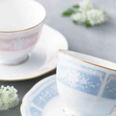 ・ノリタケ【レースウッドゴールド】カップ&ソーサーペア[2客(ブルー1客・ピンク1客)]