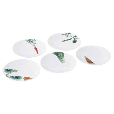 スクエアプレートなどのモダンなアイテムと水彩タッチで描かれたみずみずしい京野菜の組み合わせが、和洋中どんなジャンルの料理も受け止める、オールマイティーな器です。