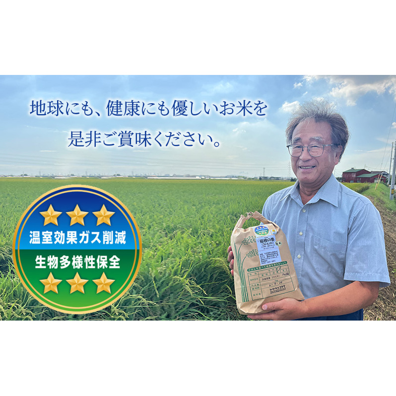 農林水産省が進める環境負荷低減の「見える化」事業の温室効果ガス削減と生物多様性保全の両部門で、最高評価の三つ星を獲得した最高級コシヒカリ。