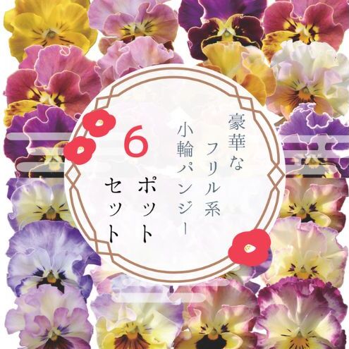 1セットにフリル系小輪パンジー『夢みるパンジー』、『アデール』、『アリス』などの品種の10.5cmポットの苗が6ポット入ります。