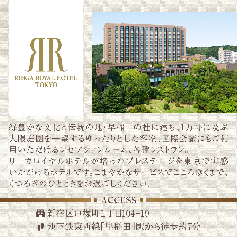 〒169-8613 東京都新宿区戸塚町1丁目104−19 リーガロイヤルホテル東京1階