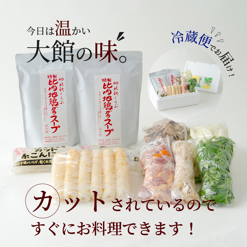 きりたんぽ12本、スープ3600ml、比内地鶏600g、ごぼう、まいたけ、ねぎ、せり、糸こんにゃく