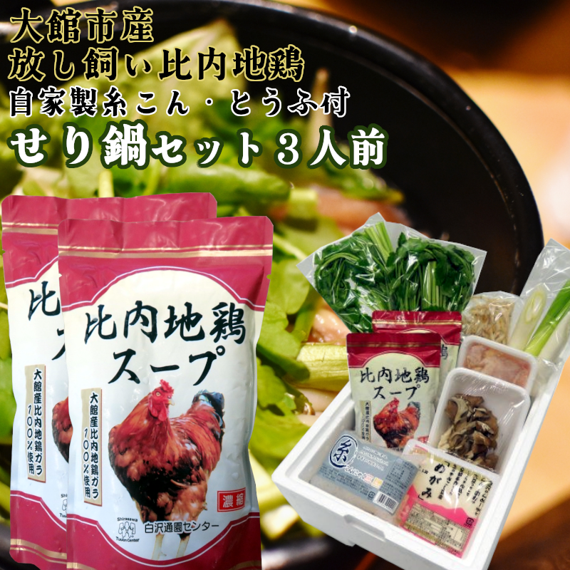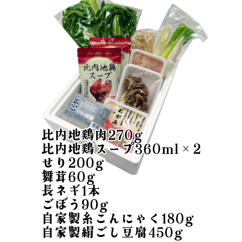 区域内で生産されたスープ(スープは区域内の比内地鶏・ガラ、区域外の調味料を使用して製造しており、区域外の割合は1割程度)、豆腐、こんにゃく、区域外で生産された野菜(セリ)のセット。製造工程は全て区域内で行っており、区域内での加工工程が価値の半分を一定以上上回る割合を生み出している。また、当該返礼品の「重量」の割合も5割を十分に上回っている。