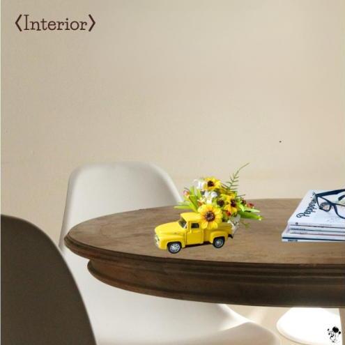 ひまわりや実ものを乗せたイエロートラックのアレンジメント。
