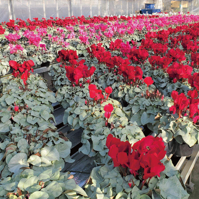 当園では育種にも力を入れており、シクラメンでは現在5色展開の「プラチナリーフ」シリーズ、
