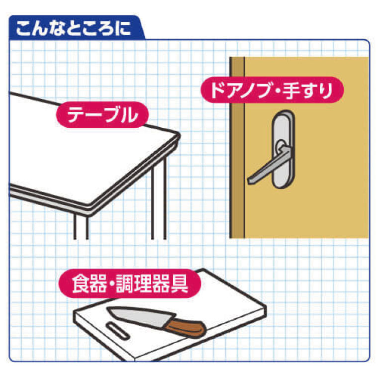 キッチンやダイニングでの使用はもちろん、ドアノブや手すりなど、身のまわりをトータルに除菌。