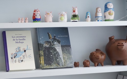 缶は当店のオリジナルキャラクター、ブタの「モンブーちゃん」がクッキーを焼く様子を描き起こしたオリジナルイラストをあしらっています。