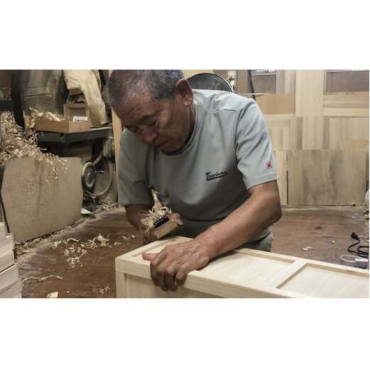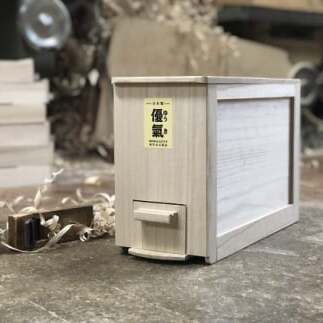 材料に桐天然木を使い桐材がもつ湿度・温度をコントロールする特性や防虫効果を生かした職人手作りの米びつです。桐材の特性を生かすために塗装はしておりません。そのためご使用いただくごとに色が徐々に飴色に風合いよく変色していきます。それにより桐材としての特性をさらに発揮します。加えて、本品はつまみを引き出すと1合分のお米が米受け皿に落ちる計量機能(内部に一合マスを内蔵)もついております。当社商品の「米蔵」をさらに使いやすく改良した商品です。天然木を使い風合いよく機能的なこの米びつは、末永くご愛用いただきたい逸品です。