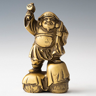もとはインドより仏法守護の神として伝来しましたが、後に日本神話の大国主命(おおくにぬしのみこと)と結びつき、福の神として信仰されました。打出の小槌と大きな袋を持ち、米俵に乗ったお姿です。