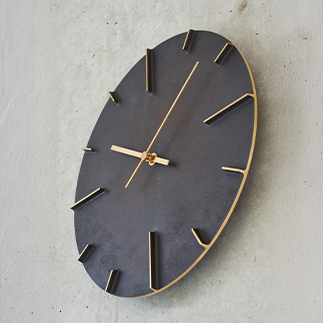 打ち放しコンクリートや煉瓦といった、強い素材感をもった壁面に掛けても見劣りしない、質感豊かな時計です。