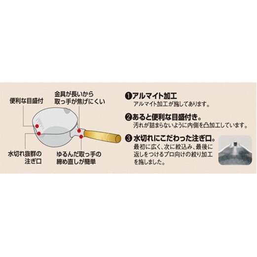 材質:本体/アルミニウム(硫酸アルマイト加工)、表面/槌目加工、ハンドル/天然木製ハンドル