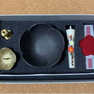 うめをモチーフにした燭台と香炉のセット。うめが描かれた和ろうそくと梅の香りの線香が入っています。