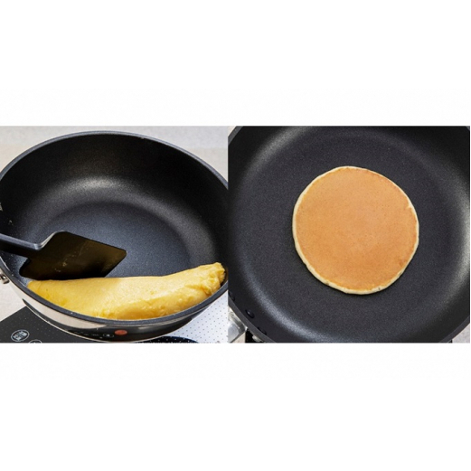 ◆熱変形に強く丈夫で長持ち/熱変形とは、加熱によってフライパンの本体が変形してしまうこと。中心部が盛り上がり油が側面に溜まった経験はありませんか?本品は、底面にしっかりと厚みがあるので熱変形に強く、フライパン本来の形状が長持ちします。熱をかける裏面は、超高温に溶けた鉄粉をエアー圧によって底面に溶着させて、さらに腐食防止のアルミ溶射、最後にセラミック塗装を実施。この特殊溶射加工で製品安全協会が安全な製品と定めた基準(CH-IH)もクリア。