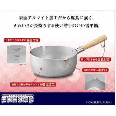 表面アルマイト加工だから腐食に強く、きれいさが長持ちする使い勝手のいい雪平鍋です。使いやすさのポイントは、水切れが良い注ぎ口や分量が分かりやすい目盛が付いていること。また、取っ手は木製で手になじんで、付け根の金具が長く焦げにくくなっています。表面に槌目加工を施すことにより、強度の向上と加熱効率アップをはかっています。