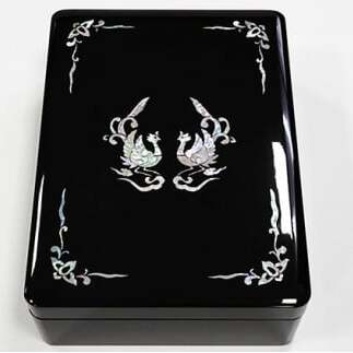 木製木地にて吉祥模様とされる鳳凰の図を螺鈿にて加飾してあります。A4用紙が入る大きさです。