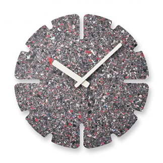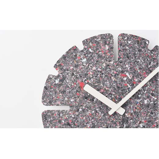 廃棄衣料品で作られる板は全てに微妙な色や模様の違いがあり、同じものが2つとなくその違いを楽しめることも特徴の一つです。また、使われなくなった時計は回収し、再びマテリアルに戻り、新たな時計として生まれ変わります。紙や木材の型抜きを行うトムソン加工で切り抜き、素材の表情をそのまま生かしたミニマルなデザインのこの時計は空間に馴染むアートピースであり、静かに時の経過を知らせるプロダクトでもあります。