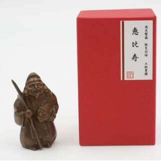 ミニサイズで飾り場所を選ばない吉祥置物。七福神の信仰は室町時代末期に始まり、江戸中期から広く庶民に定着するようになったと伝えられています。愛嬌あふれる縁起の神仏として今なお親しまれています。日本の神で七福神の一柱 右手に釣竿 左わきに鯛を抱え豊魚の神様として崇められています。