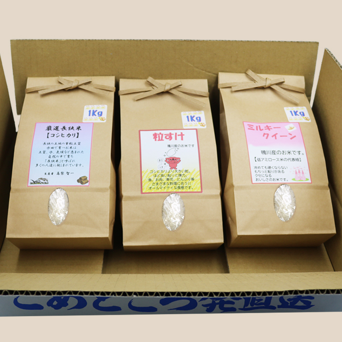 「くわっせ~鴨川」より、鴨川産のこだわり米3品種・各1kgセットでお届けします。