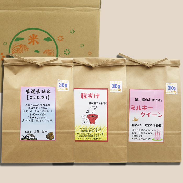 「くわっせ~鴨川」より、鴨川産のこだわり米3品種・各3kgセットでお届けします。