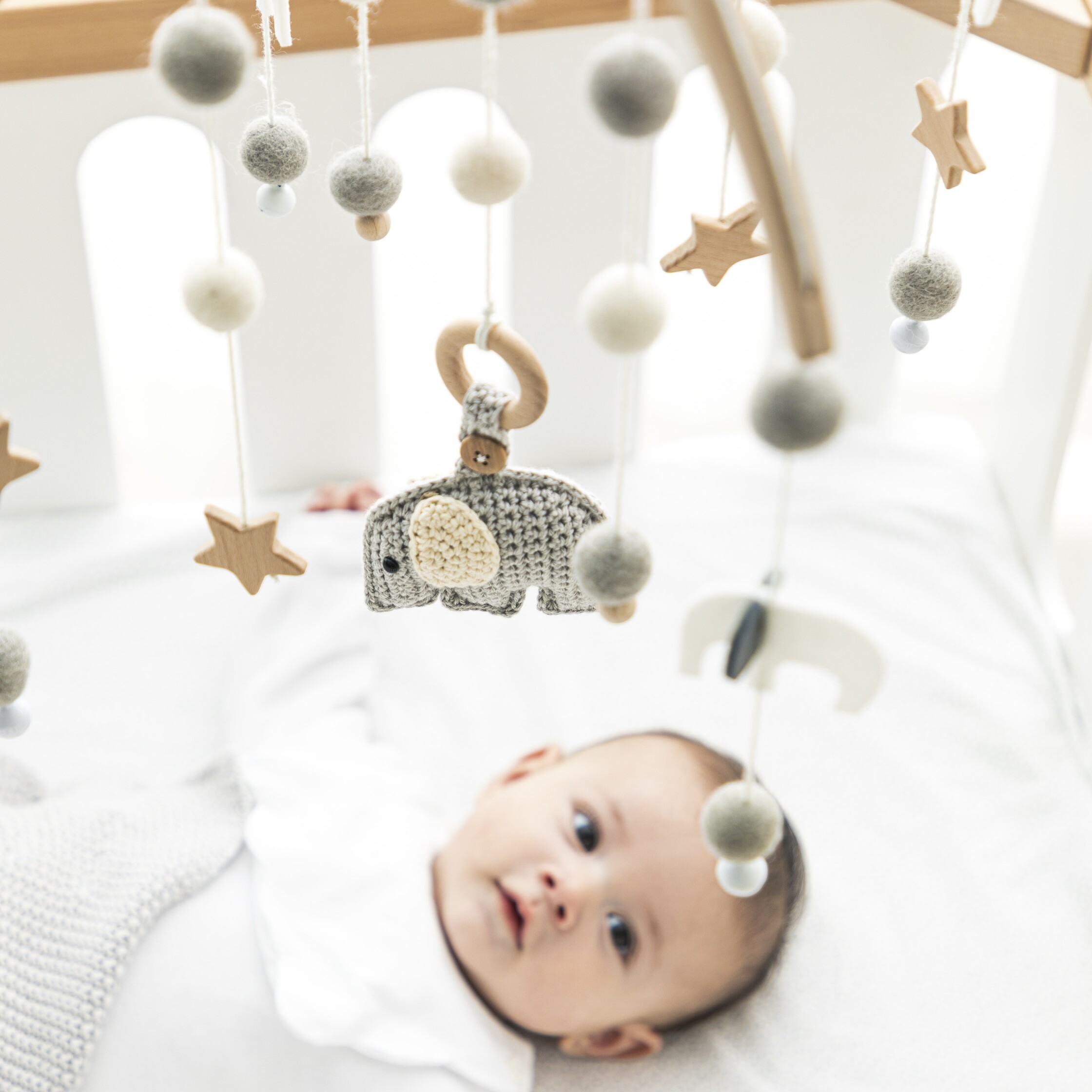 ゆらゆらと動くモチーフを目で追ってからからとやさし響く鈴の音色を聞いて目と耳で楽しみ、自然と健やかな眠りへ導きます。
