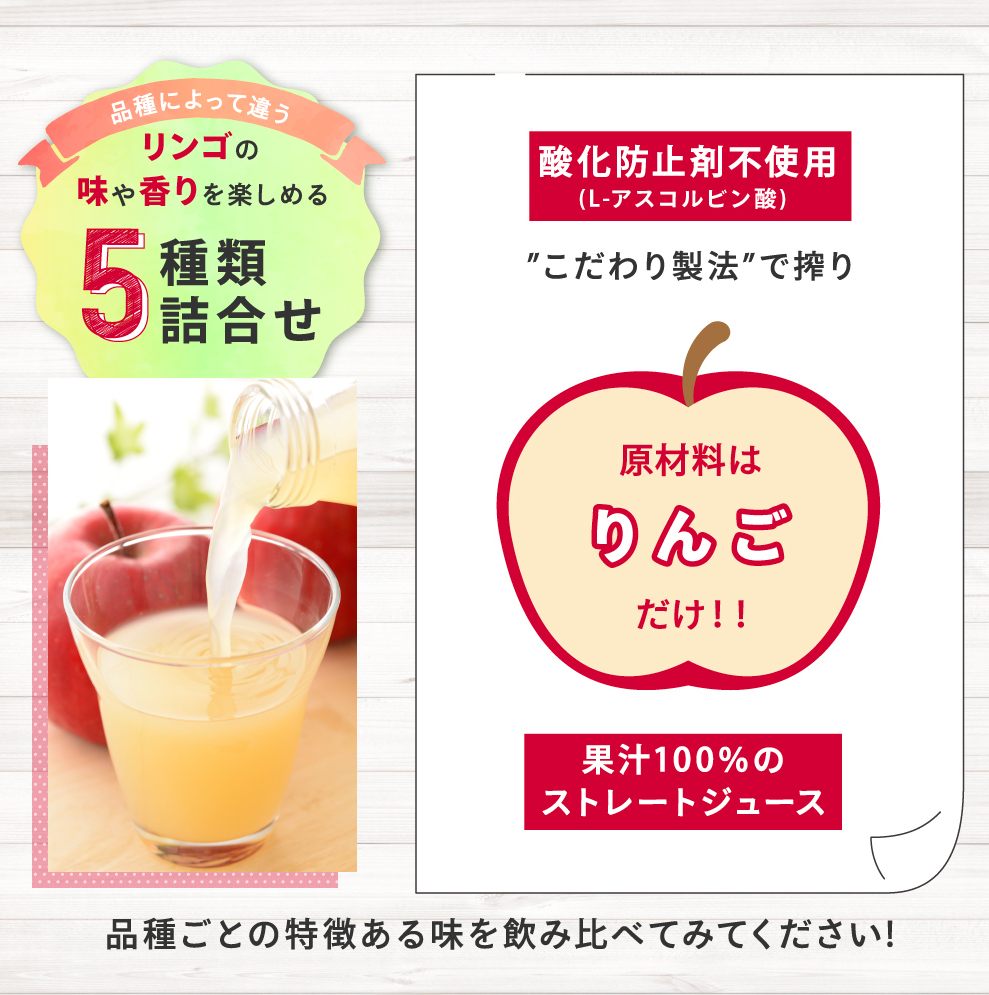 その品種ごとのおいしさを味わっていただけるよう、品種ごとに搾ったりんごジュースを5種類詰め合わせました。