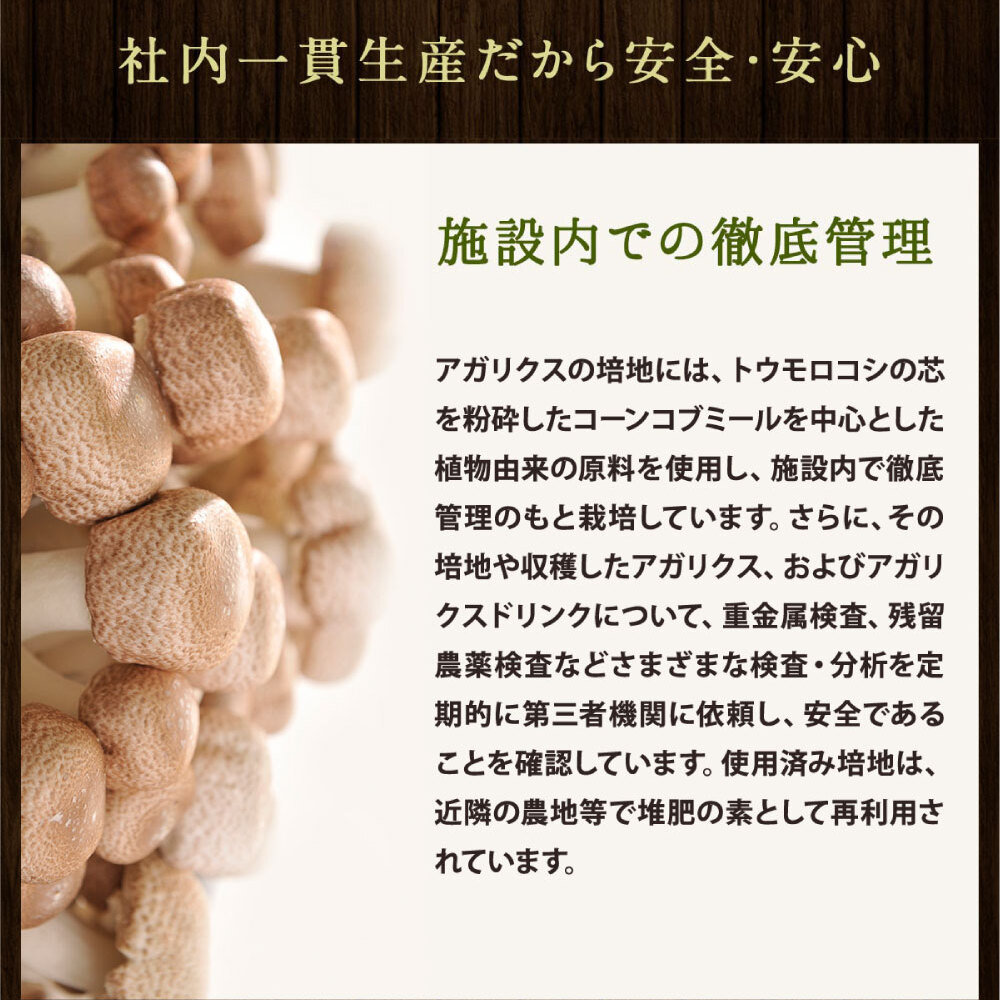 ホクト青木島センター(長野市)にて収穫したアガリクスを収穫後すぐに一滴の水も加えず絞った「100%アガリクスエキス」無農薬、無添加のアガリクスドリンクです。