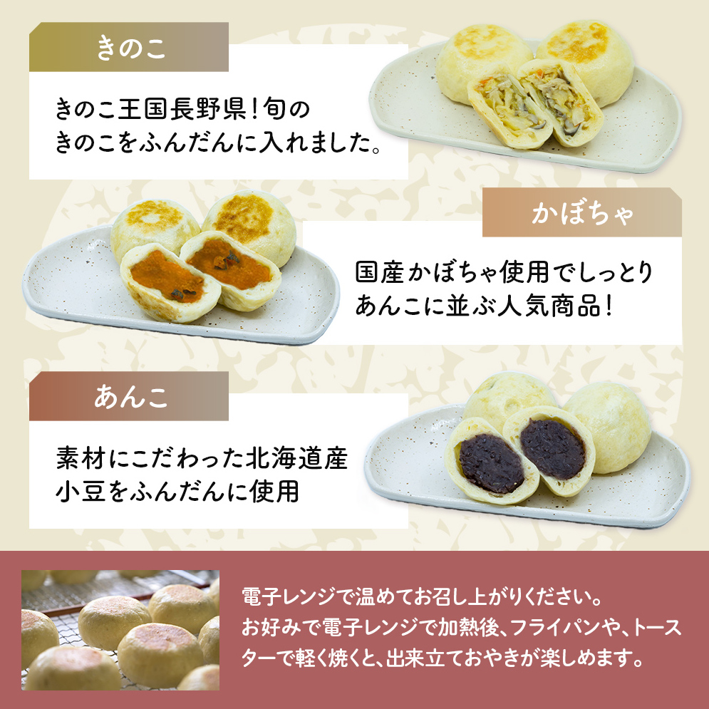 【おやき】国産材料にこだわり、ふっくらもちもちした皮にたっぷりと包み込みました。