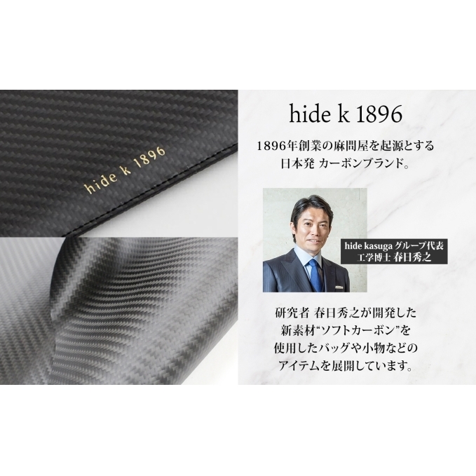 1896年長野市で創業した麻問屋を起源とするカーボンブランド「hide k 1896」は、オーナーである工学博士の春日秀之が開発した新素材「ソフトカーボン」を使い、バッグや小物などのカーボンアイテムを展開しています。