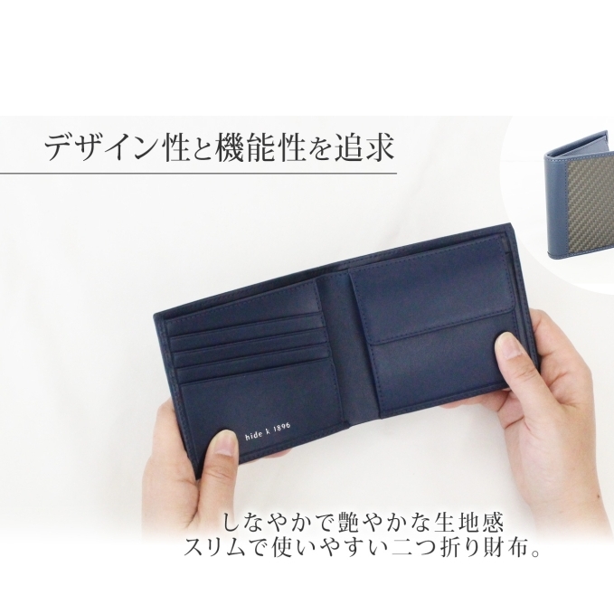 hide k 1896 ソフトカーボン バイフォールド ウォレット 二つ折り財布【ネイビー】bi-fold wallet 11.5cm×10cm×2cm メンズ財布 サイフ 札入れ カード コインケース 本革 カウレザー 長野県長野市 小物