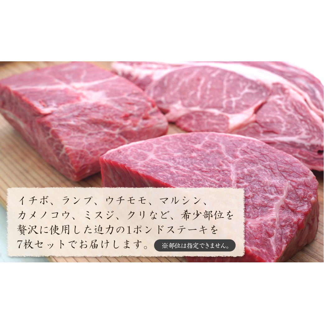 イチボ、ランプ、ウチモモ、マルシン、カメノコウ、ミスジ、クリなど、希少部位を贅沢に使用した迫力の1ポンドステーキを7枚セットでお届けします。