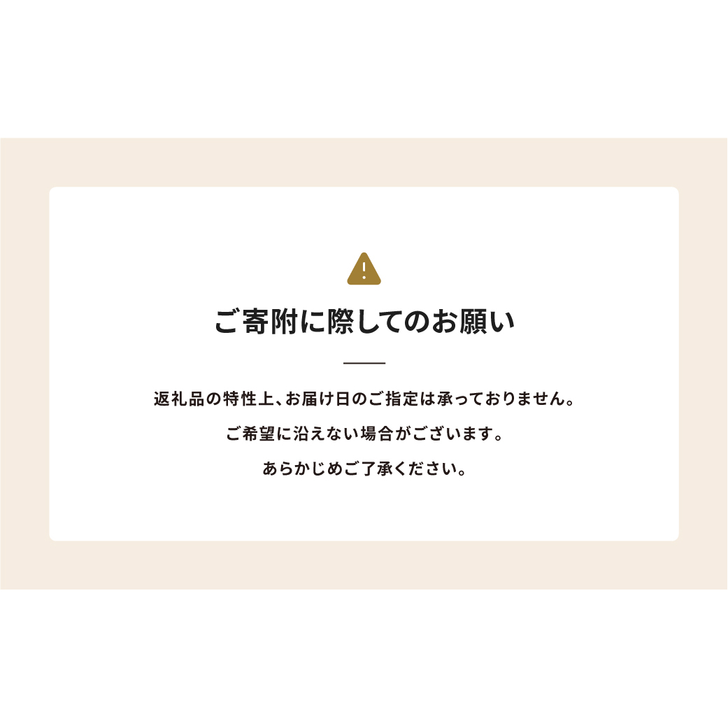 返礼品の特性上、お届け日の指定は承っておりません。ご希望に添えない場合がございます。あらかじめご了承ください。