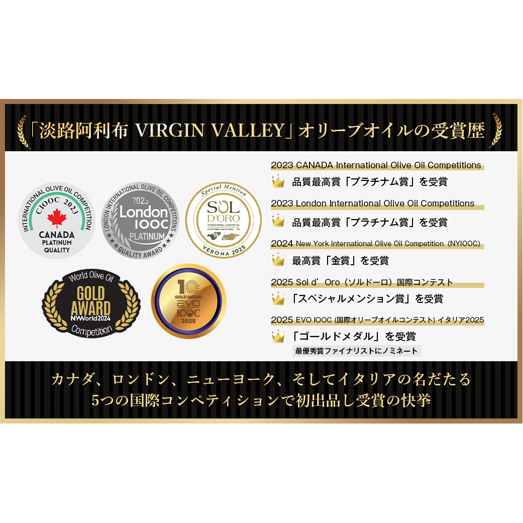 収穫量が限られており、Virgin Valley Awaji Olive Farmの市場に出回る事のない貴重なオリーブオイル!某有名レストランも味に感動し、実際に料理に提供して頂いている一品。