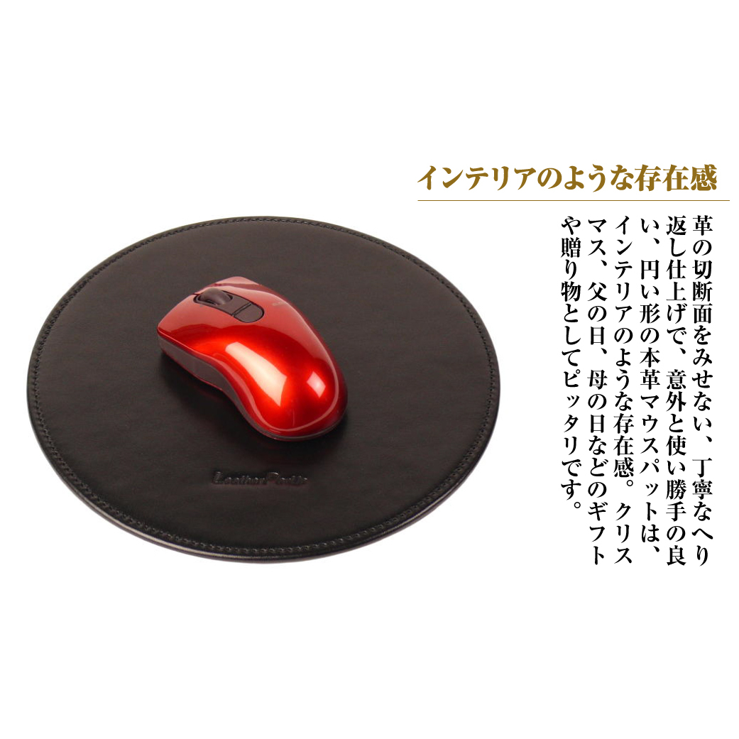 【贈り物にどうぞ】 革の切断面をみせない、丁寧なへり返し仕上げで、意外と使い勝手の良い、円い形の本革マウスパットは、インテリアのような存在感。クリスマス、父の日、母の日などのギフトや贈り物としてピッタリです。