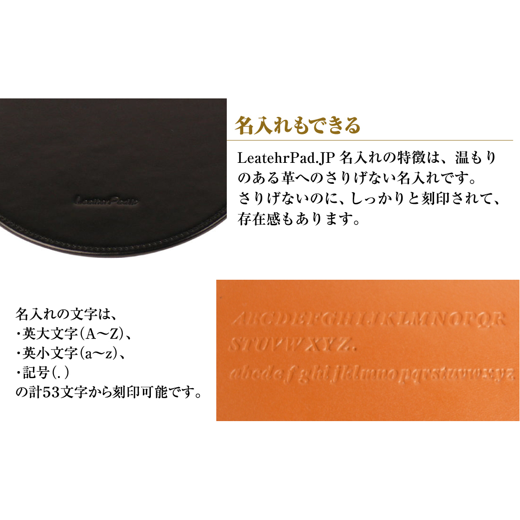 名入れ刻印サービス(15文字以内)が無料で利用可能です。名入れの文字は、英大文字(A~Z)、英小文字(a~z)、記号(.)の計53文字から刻印可能です。名入れの位置につきましては、LeatherPad.JPのロゴが入っている位置に、LeatherPad.JPのロゴの替わりに、ご希望の文字の名入れ・刻印をさせていただきます。