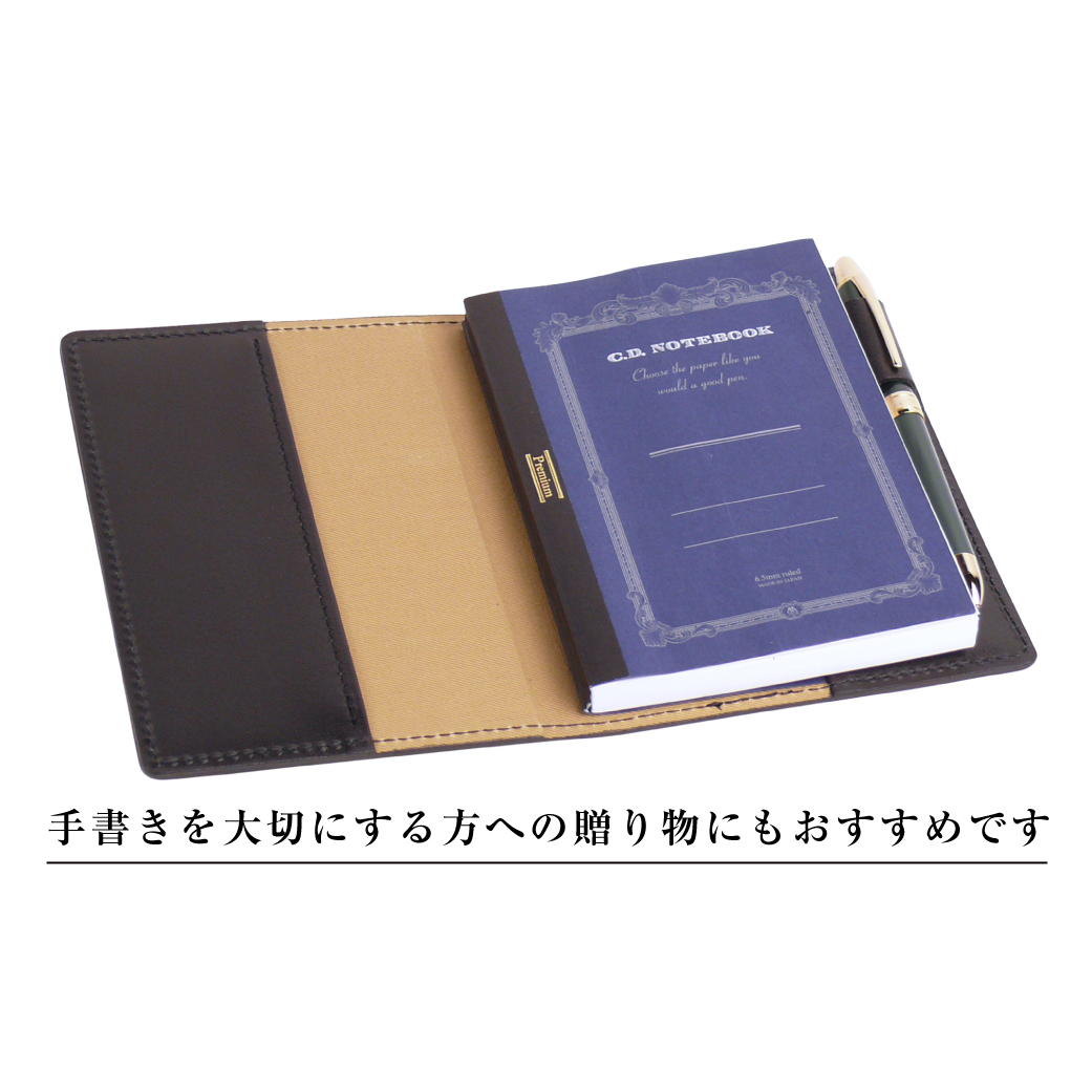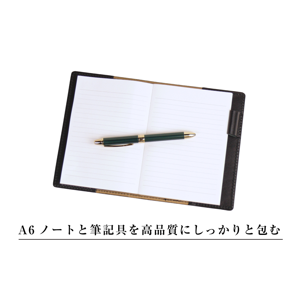 上質な本革の質感と無駄を省いたシンプルな構造が魅力のA6日本製ノートカバー。ビジネスでもプライベートでも使いやすく、手書きを大切にする方への誕生日や父の日、就職祝いなどの贈り物にもおすすめです。