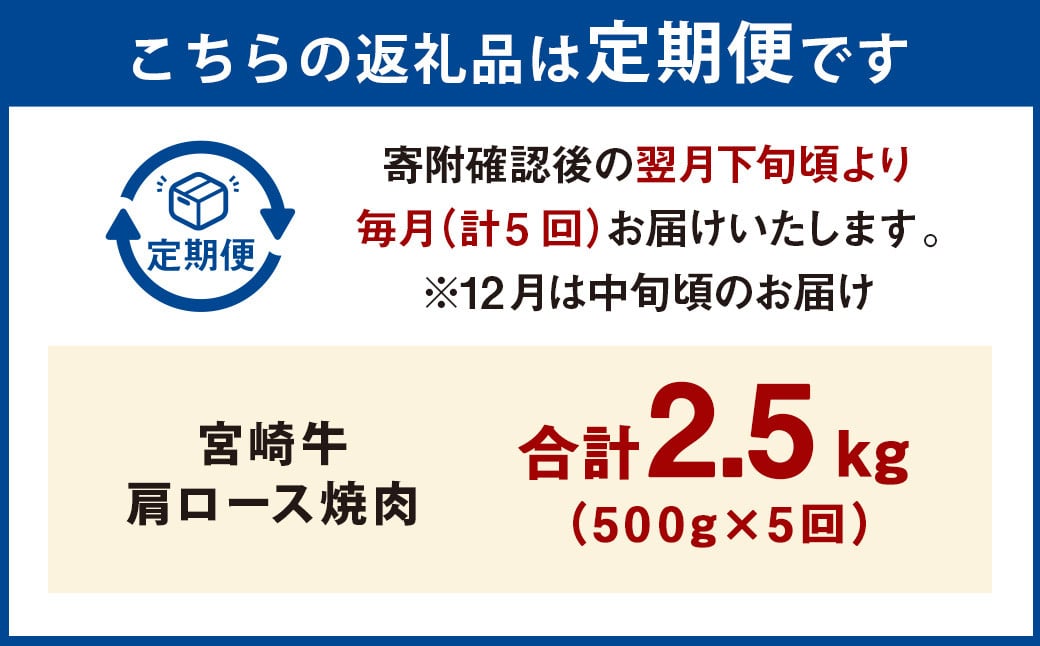 6. 【5ヶ月定期便】<宮崎牛肩ロース焼肉 500g(1パック:500g×5回)> お申込みの翌月下旬頃に第一回目発送(12月は中旬頃) 牛肉 お肉 肉 和牛 新生活応援 卒業祝い 就職祝い 入学 卒業 お花見 引越し