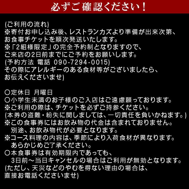※寄付お申し込み後、レストランカズより準備が出来次第、お食事チケットを順次発送いたします。