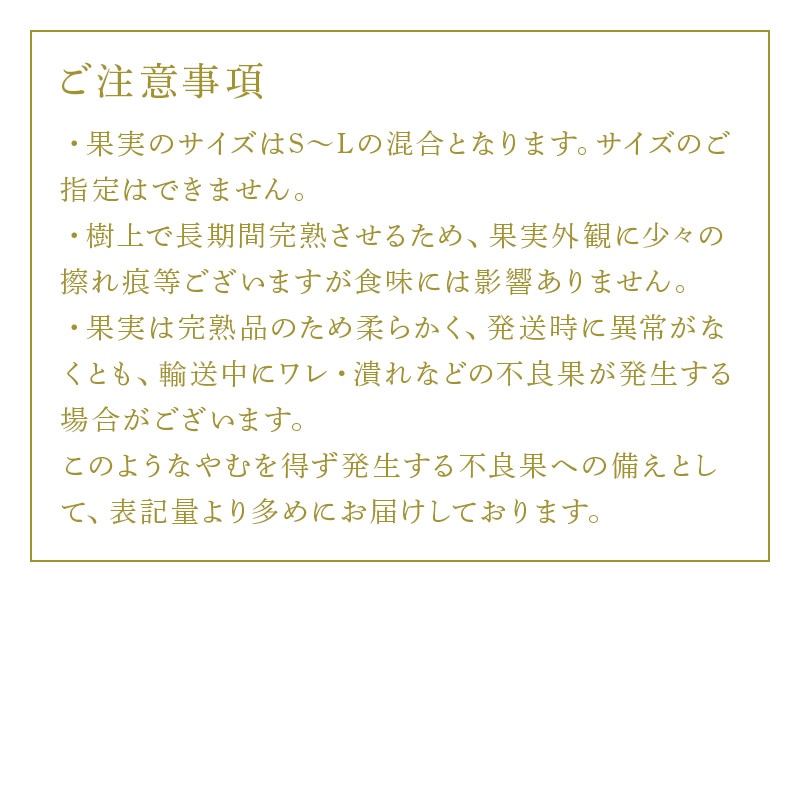 ・果実は完熟品のため柔らかく、発送時に異常がなくとも、輸送中にワレ・潰れなどの不良果が