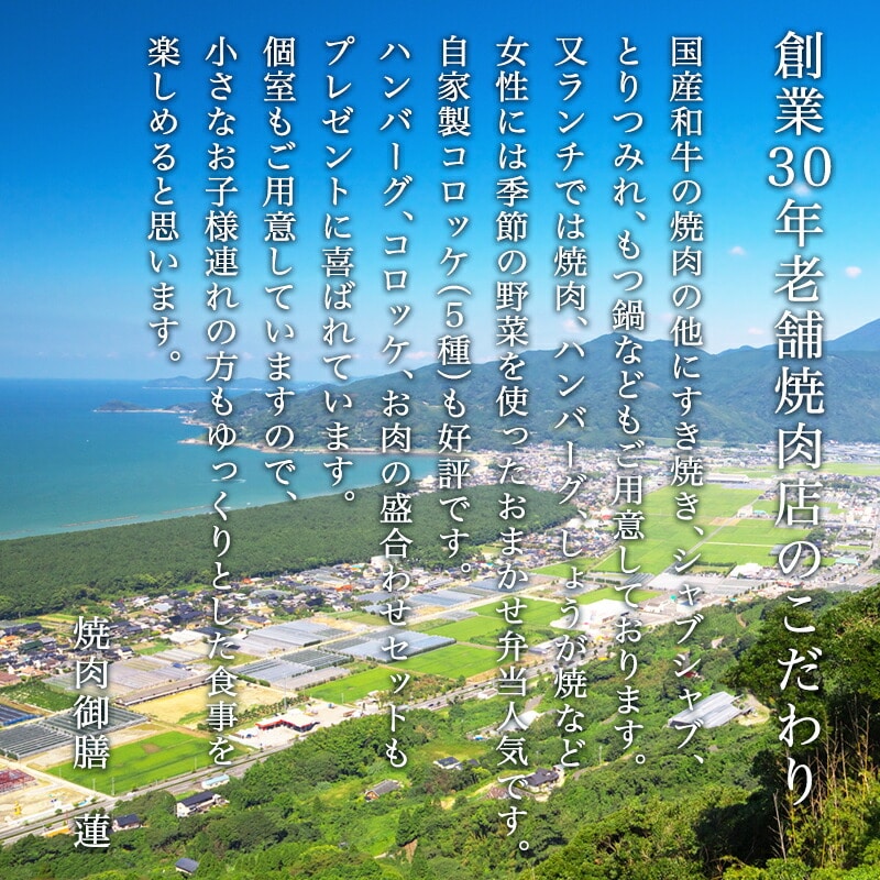 肉は九州産黒毛和牛と佐賀県産豚のみを使用しふっくらやわらかジュ-シ-で子供からお年寄りまで喜ばれます。