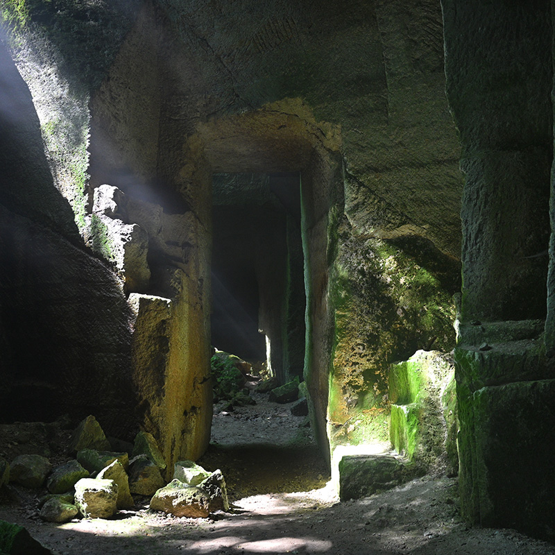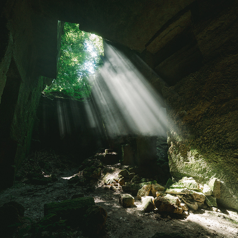 1887年頃(明治20年)、宮谷石を切り出していた職人だけが知る神域のようなこの場所は、戦後のセメント普及で廃坑となりました。今では苔むす石壁と深い森に包まれ、時が止まったかのような幻想的な空間が広がっています。