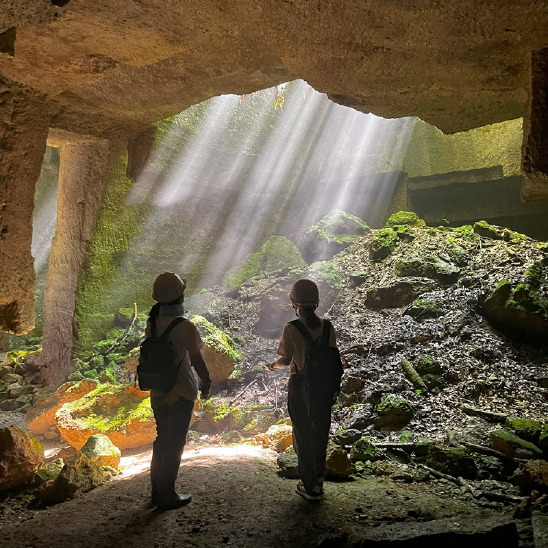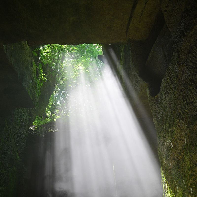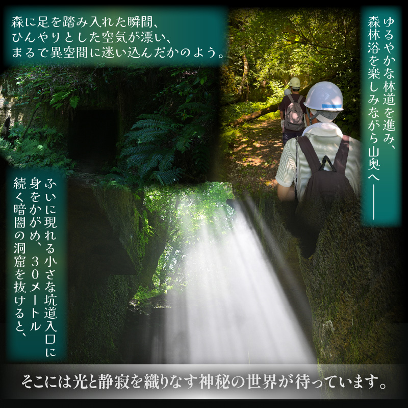 ゆるやかな林道を進み、森林浴を楽しみながら山奥へ。森に足を踏み入れた瞬間、ひんやりとした空気が漂い、まるで異空間に迷い込んだかのよう。ふいに現れる小さな坑道入口に身をかがめ、30メートル続く暗闇の洞窟を抜けると、そこには光と静寂を織りなす神秘の世界が待っています。